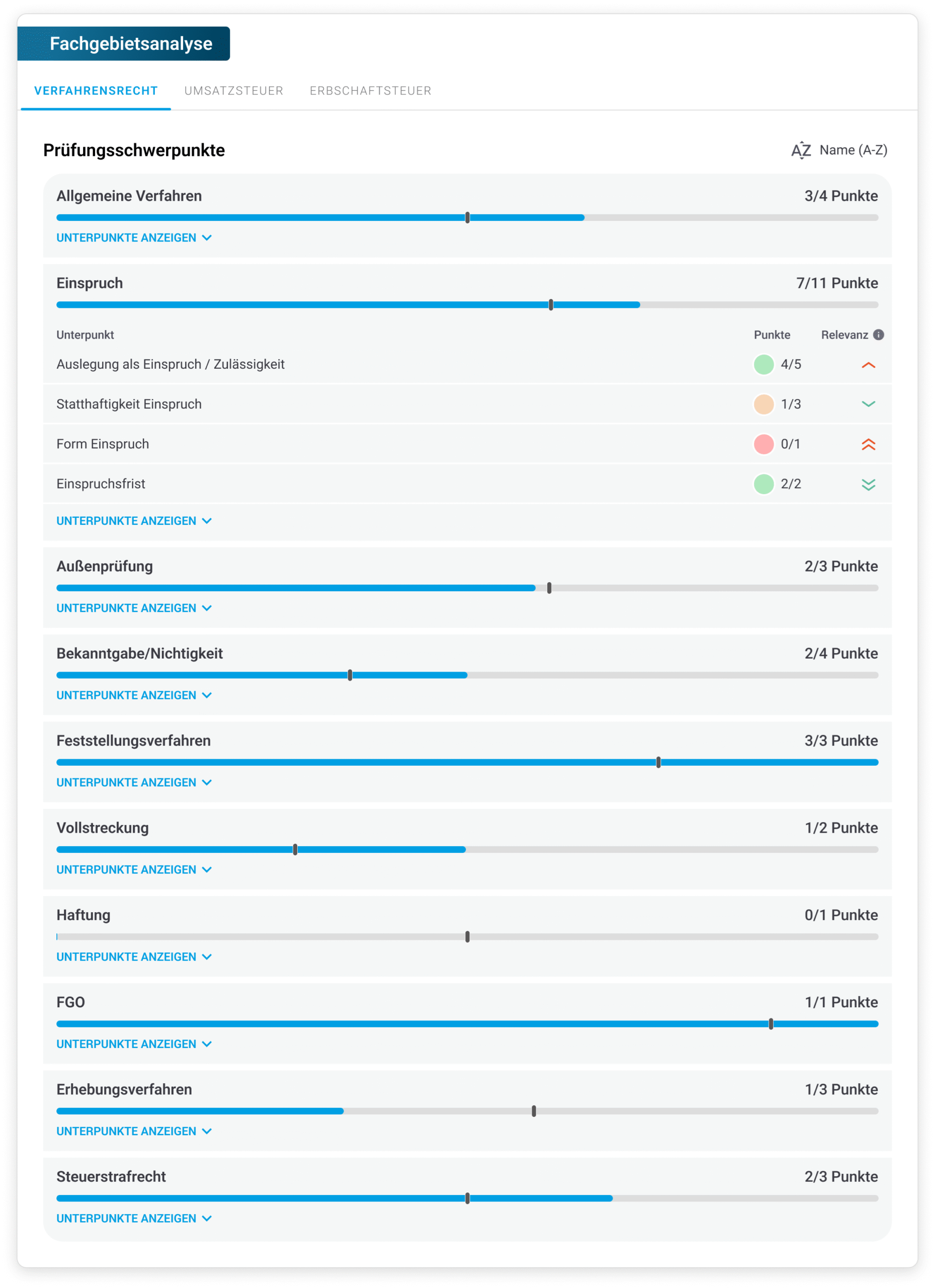 - Überblick über Ihren Lernstand in jedem Prüfungsschwerpunkt